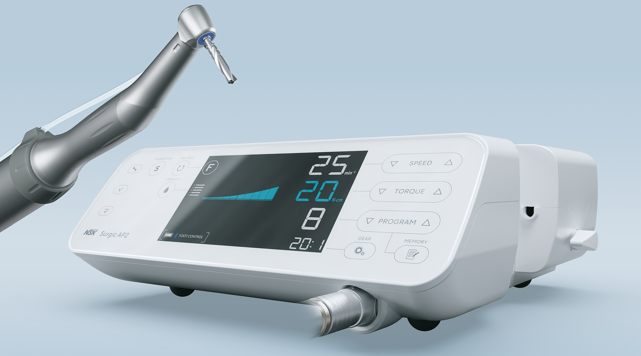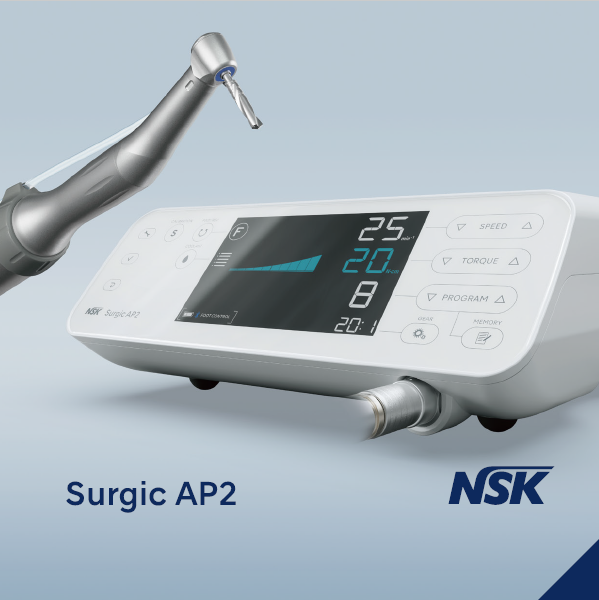 Surgic AP2, el sistema de micromotor quirúrgico de NSK, ha alcanzado la siguiente etapa en su evolución. Se ha mejorado la visibilidad y operatividad mediante la incorporación de un monitor LCD. La pieza de mano y el motor se han hecho más ligeros y compactos. El pedal de control inalámbrico permite a los profesionales concentrarse completamente en el procedimiento.