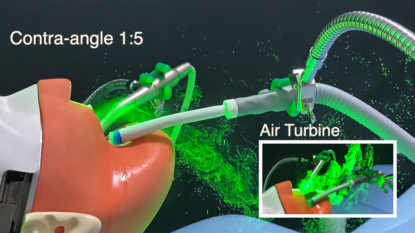 Según el experimento, los contra-ángulos producen mucho menos aerosol en comparación con las piezas de alta velocidad, lo que reduce el riesgo de infección para pacientes y dentistas.