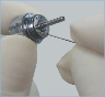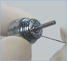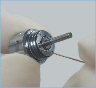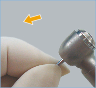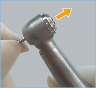 - 5. Vuelva a insertar la aguja para limpiar la boquilla en el orificio del pulverizador por el lateral del cabezal. Elimine la suciedad adherida en su interior. Conecte la pieza de mano al acople y déjela en funcionamiento con agua pero sin utilizarla.